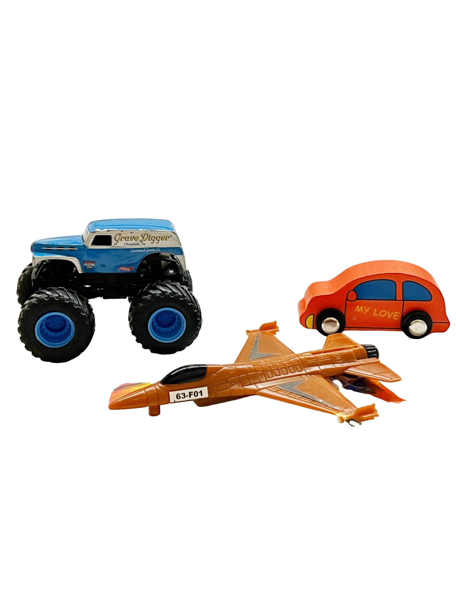 2. This bundle includes a monster truck, a car that says My Love, 63-F01 military jet.