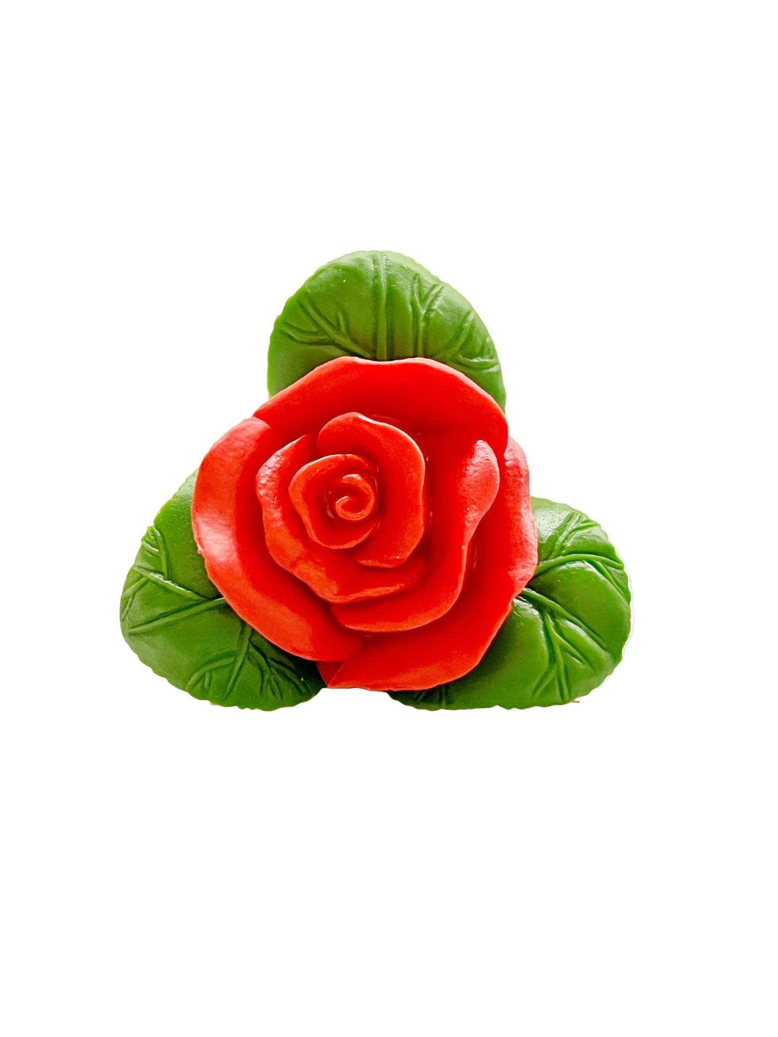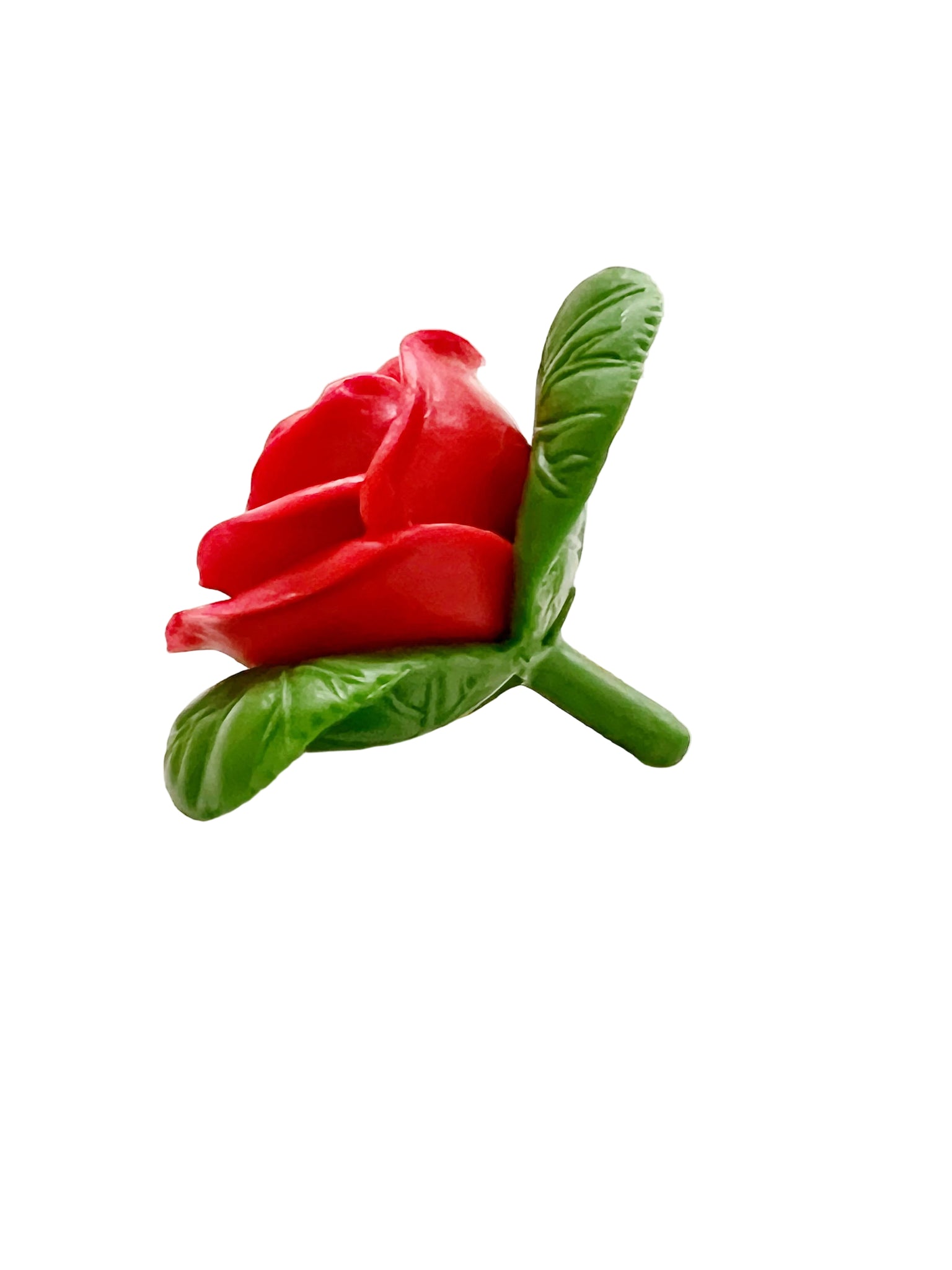 This vibrant red rose bloom is nestled against three lush green leaves, offering a pop of saturated color for any scene. Crafted from a durable, smooth rubber type material, it features a short stem on the underside that allows it to be easily "planted" or propped up at an angle. The petals are sculpted in a classic spiraling bud, while the leaves boast deep, realistic veining and a gentle sheen.