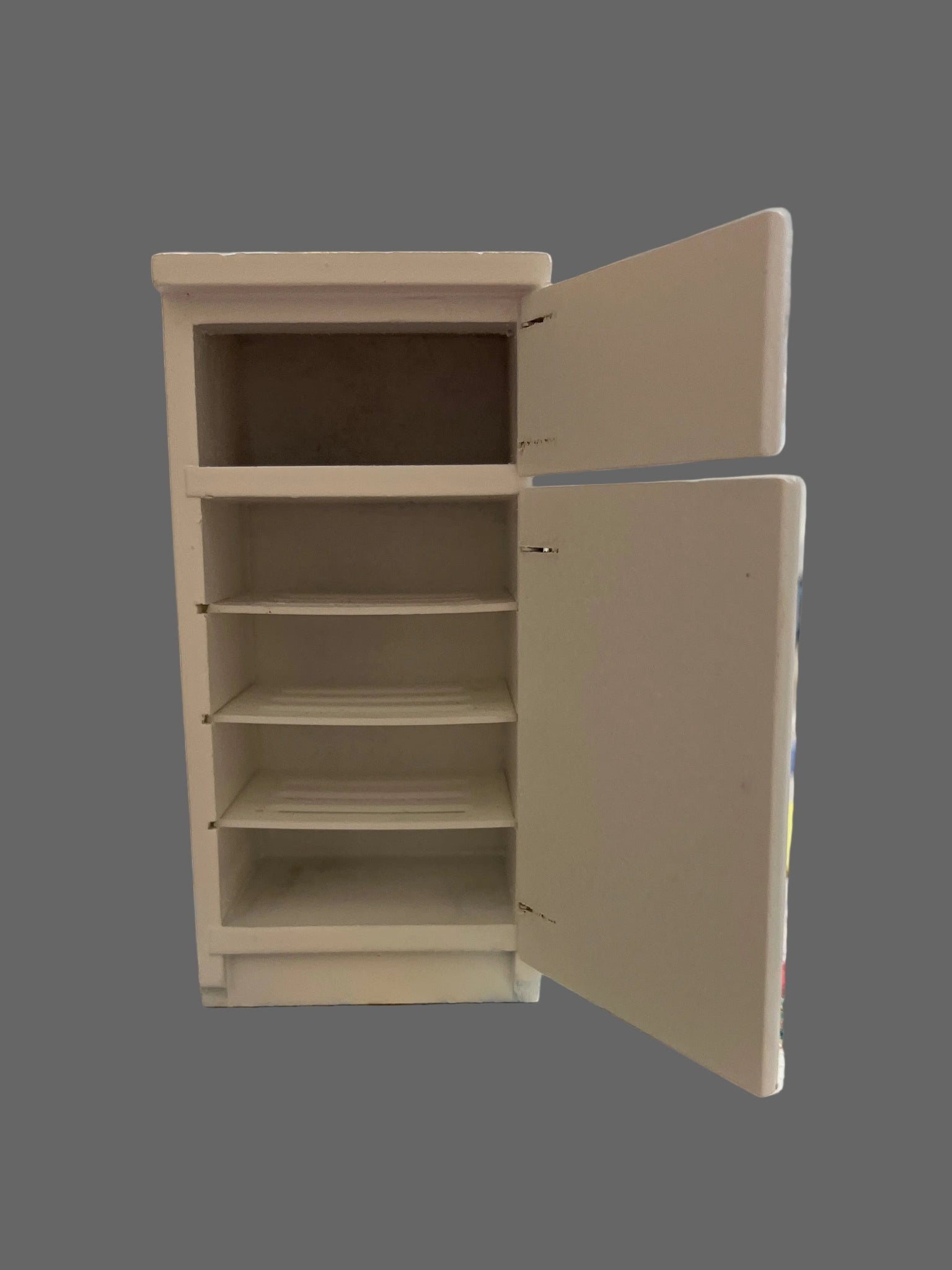 White refrigerator is made wood and the freezer and refrigerator door opens.