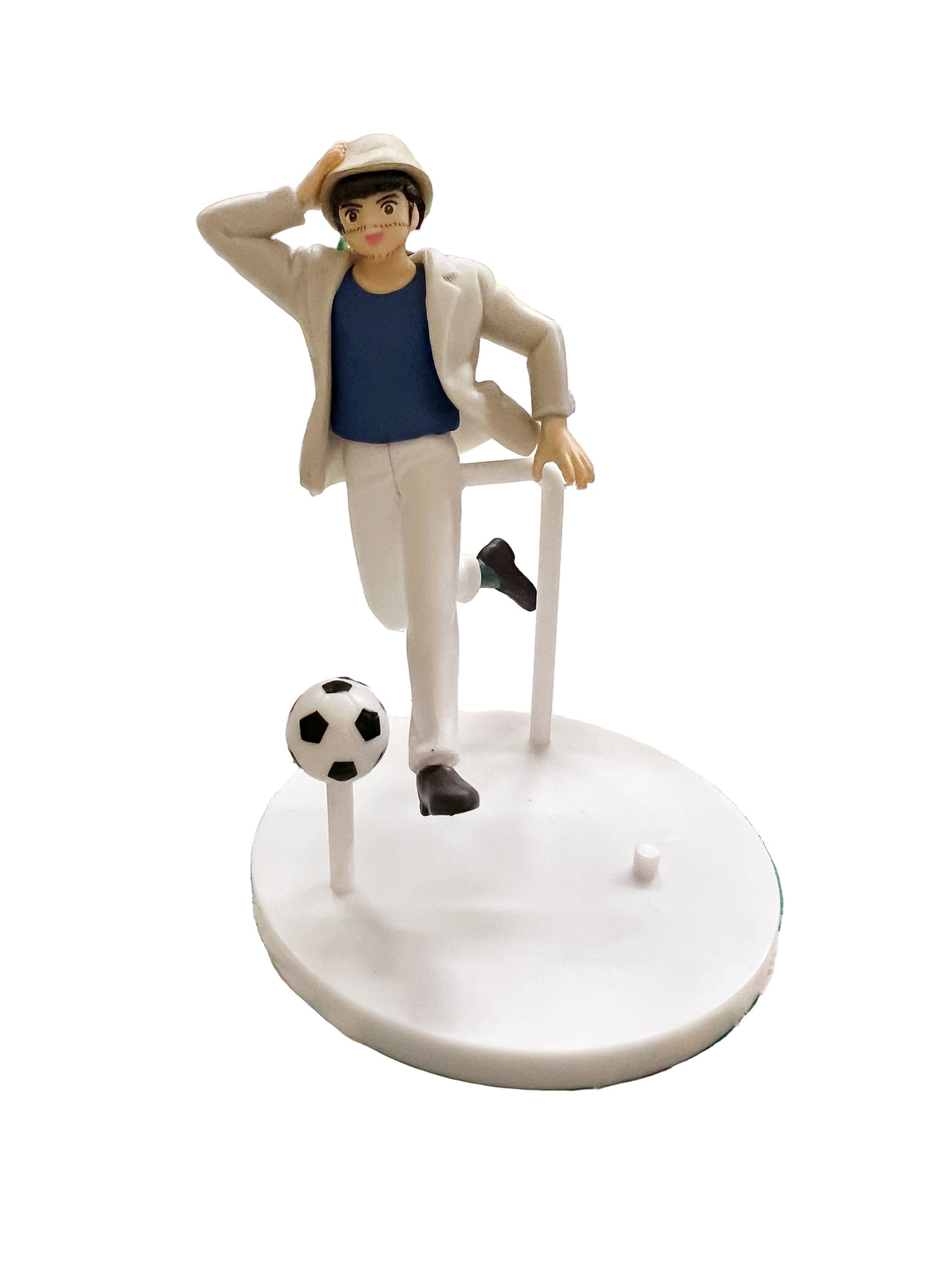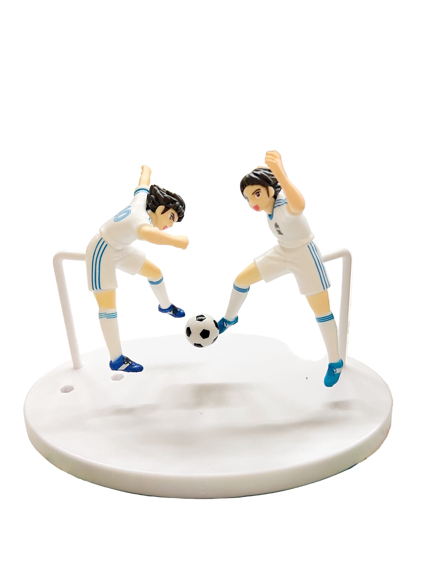 These people are getting some exercise playing soccer.  The figures are made out of plastic.  There are pieces that connect the base to the figure making it appear some of the players are above the ground.