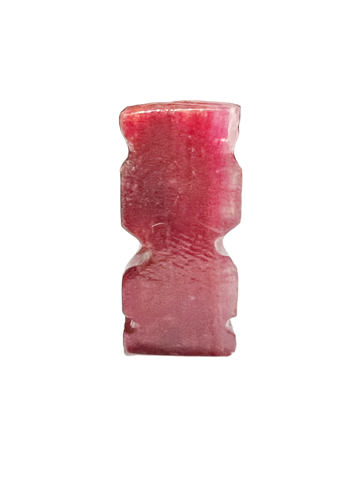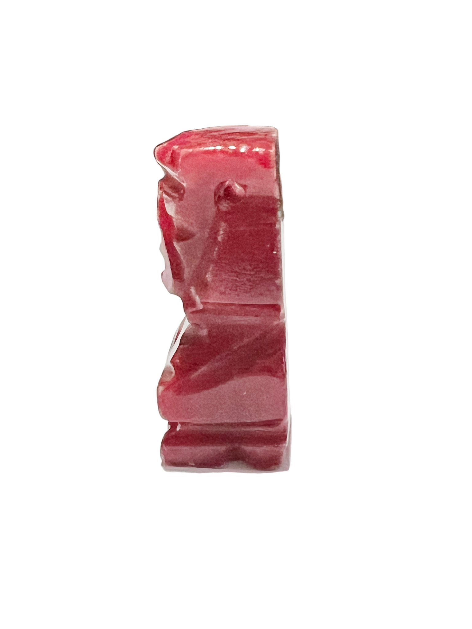 Carved from a single piece of stone, this miniature is characterized by its stunning raspberry pink and cream-white banding. The stone has a polished, smooth feel, but the details of the carved figure are a simplified, blocky form reminiscent of a Moai. The figure has a hole all the way through as if it may have been worn as a pendant previously.