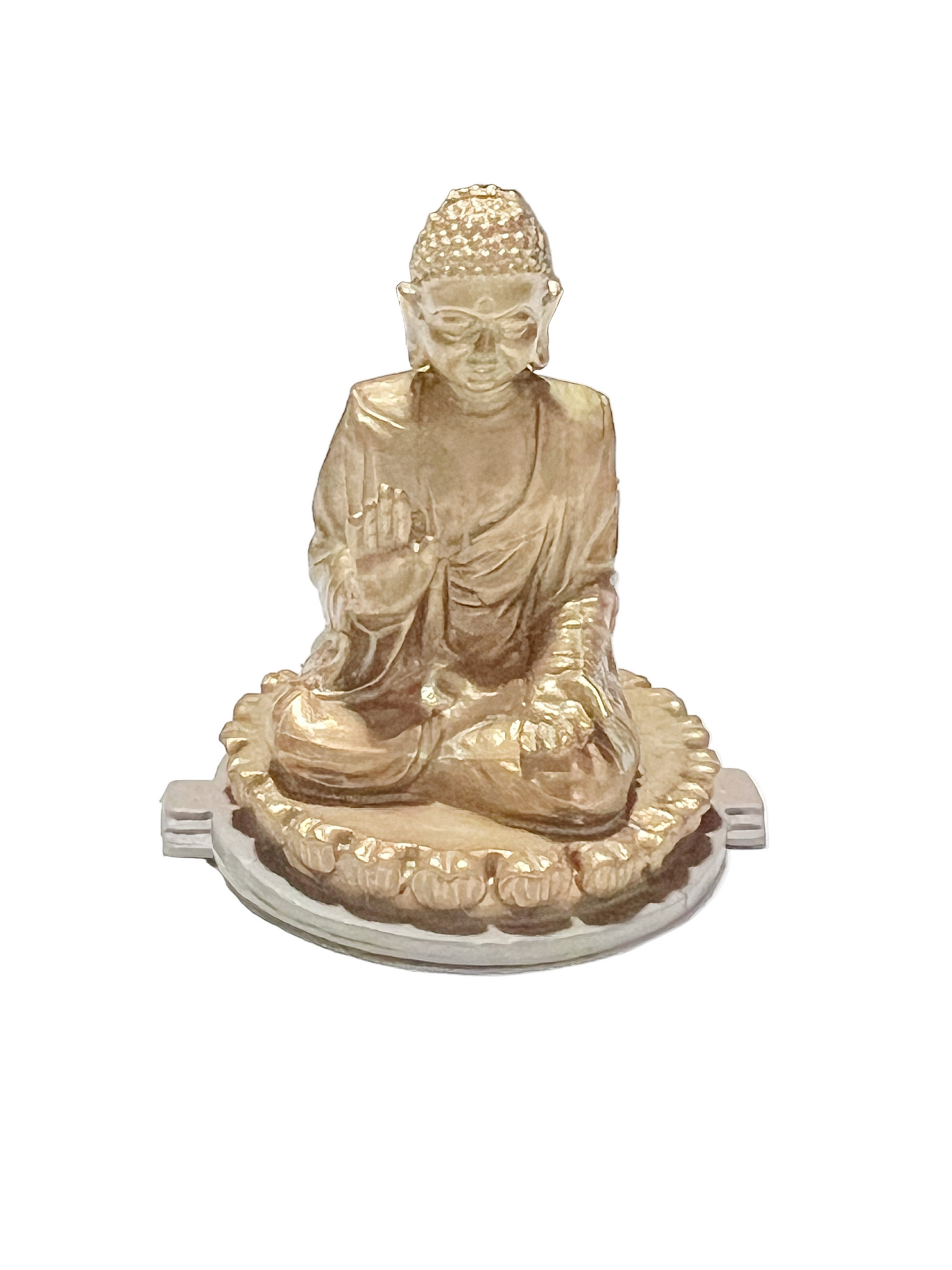 A striking figure, this miniature Buddha sits serenely in the cross-legged lotus position, radiating a brilliant metallic gold sheen that catches the light beautifully. The detail is wonderful, from the flowing robes to the intricate, raised base resembling lotus petals. Its seated posture and raised right hand (in the abhaya mudra) make it a focal point.