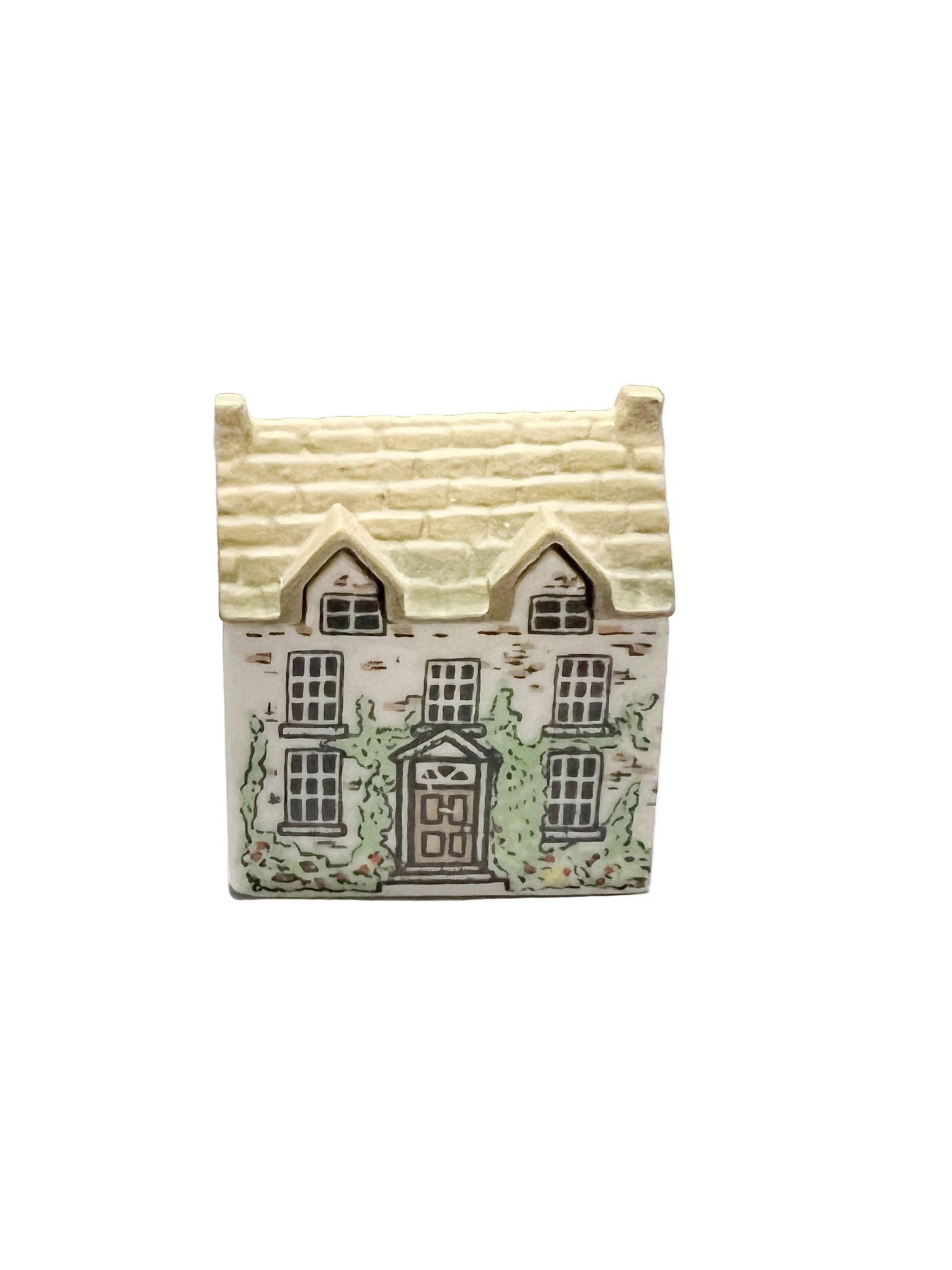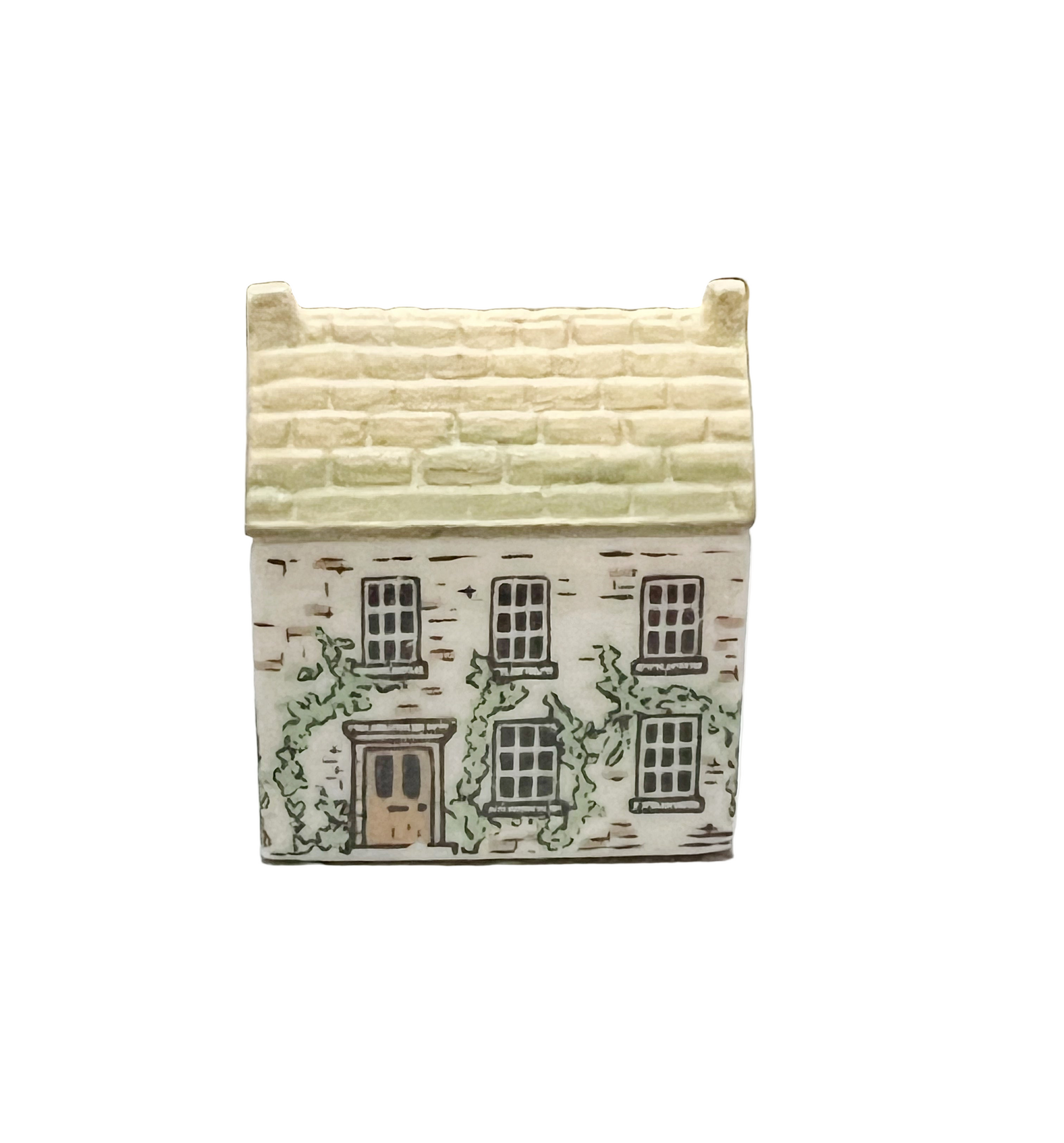This charming two-story miniature has a sturdy, block-like shape, featuring a brown-green tiled roof and pale white that mimic rough-hewn stone. The hand-painted details are delightful, including numerous square black windows and trailing green ivy winding its way around the structure.  It is ceramic and says Wade England on the bottom.
